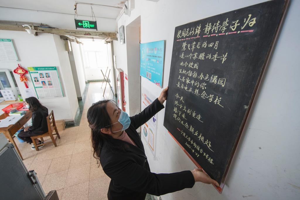 “今天终于久别重逢,接下来我们又会朝夕相处”,宿管大伯和阿姨的小黑板再次上线了,他们还细心地准备了温度计、备用口罩、消毒液、杀菌仪等各种防疫设备。“托思望云端,万里共鹭园”“确认过眼神,你是宁大最想念的仔”,一幅幅宁大专属喷绘点亮了返校学子的笑容。浙江卫视记者对宁大首批学生返校进行了拍摄采访。
