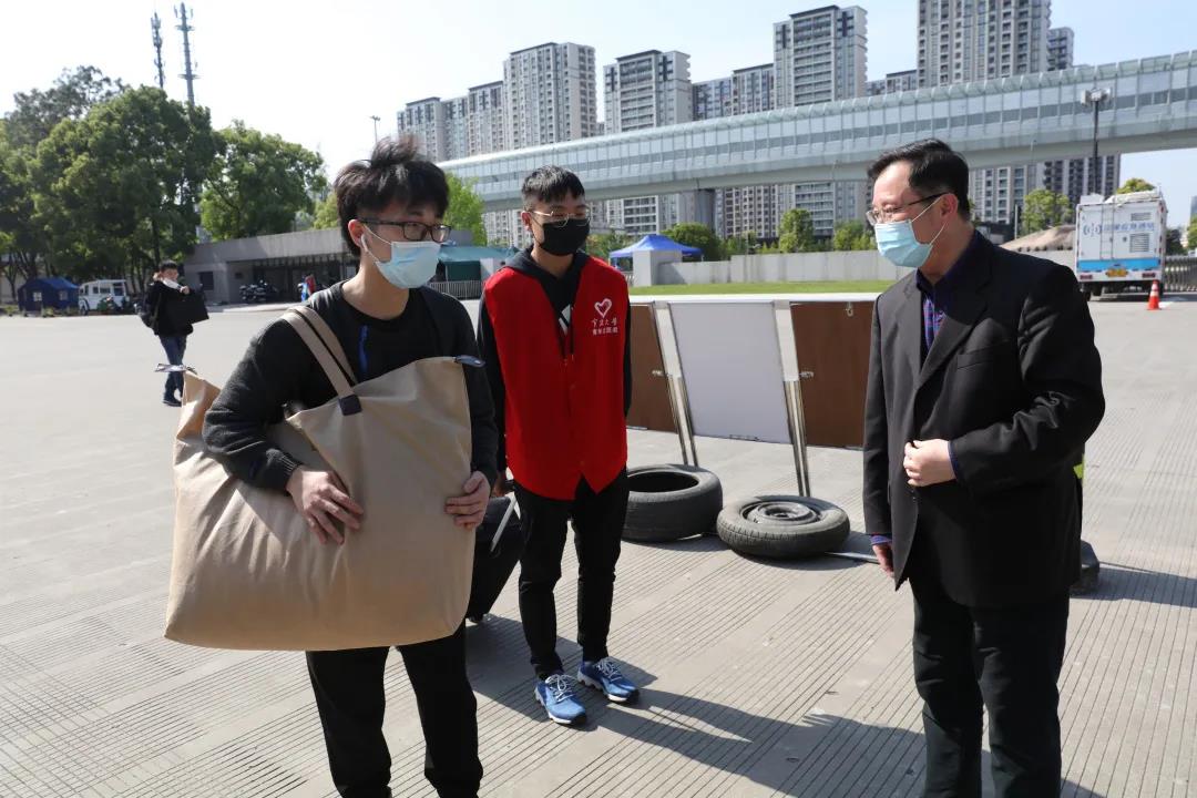 让返校同学倍感亲切的还有学校领导和老师们的热情相迎。校党委副书记冯志敏、冯杰,校纪委书记王杰法,校党委委员、校工会主席邹日强,校党委委员、宣传部部长张真柱等到校门口迎接学生返校,指导各工作组做好返校复课相关工作。