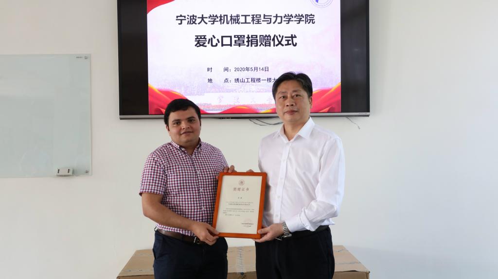 5月14日上午,宁大机械学院2017级留学生哈乐比爱心口罩捐赠仪式在绣山工程楼一楼大厅举行。校党委委员、党委宣传部部长张真柱,校党委宣传部、学生发展与服务处和机械学院相关负责人出席仪式。